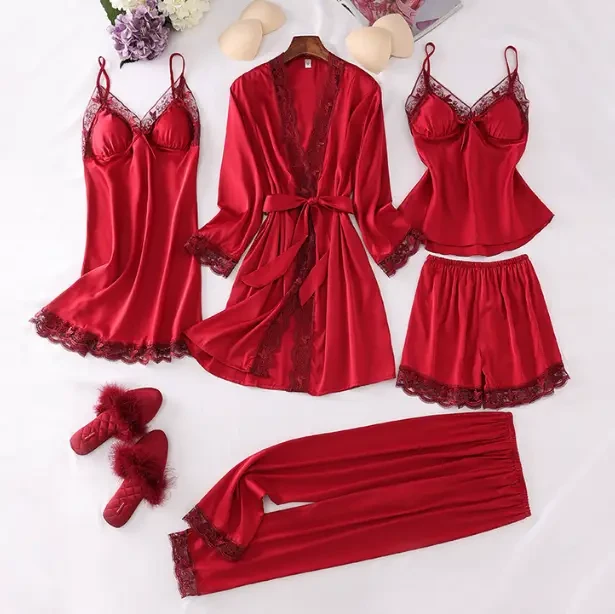 Комплектація: халат, пеньюар, пояс, штани, піжамний комплект-двійка. Бретельки регулюються по висоті.
